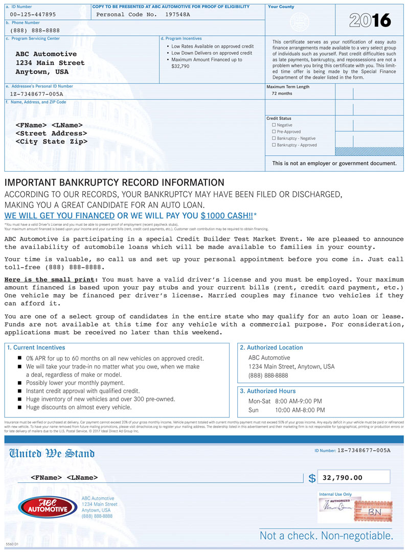 *Offer good for first-time customers, must meet minimum order quantity. Call us for details (866) 671-5272. Want mailers that drive traffic into YOUR dealership? Send me: List CountsAdditional SamplesPricing Δ